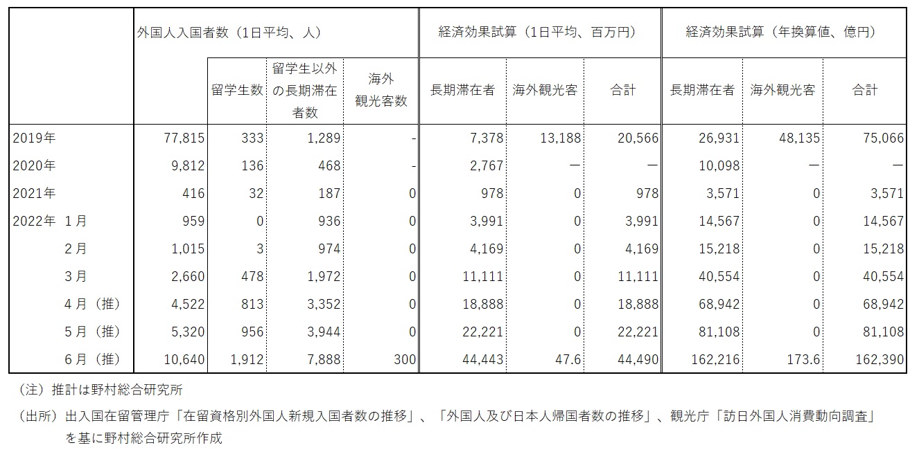 この3月の実績値から、上限が1万人となった5月と2万人になる予定の6月の外国人入国者数が、上限の引き上げと同率で増えると仮定して計算すると、5月の外国人入国者数の1日平均は5,320人(留学生956人、その他長期滞在者3,944人)、6月は10,640人(留学生1,912人、その他長期滞在者7,888人)となる(図表)。