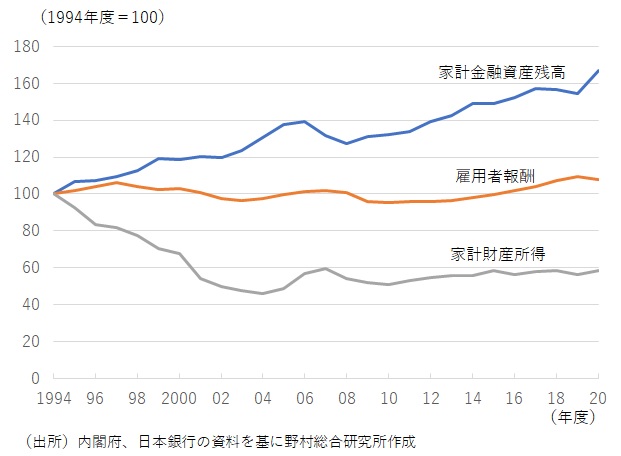 ただし、岸田政権が掲げ始めた「資産所得倍増計画」の実現は容易なことではない。1994年度を100とした場合、26年後の2020年度時点で家計金融資産は167.2、雇用者報酬は107.9、家計財産所得は58,4である(図表)。「所得倍増計画」も近い将来では実現性に乏しい計画だったが、「資産所得倍増計画」はそれに輪をかけて実現性が乏しいのである。