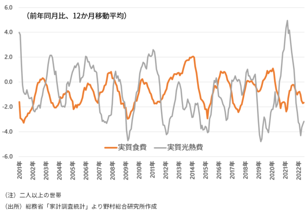 今年に入ってからの動きがそのようになっていないのは、必需性が高い食費、光熱費であっても、何とかそれらを節約し、切り詰める行動を消費者がしているからであろう。食料、エネルギー価格の上昇は、低所得者層を中心にそのように厳しい対応を強いているのである。そうした状況は海外に遅れて年明け頃まで、日本では解消されそうにない。