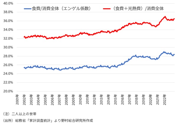 食費と共に必需性が高く、生活していくうえで欠かせない光熱費を加えた支出が消費全体に占める比率でも、同様の傾向が見られる。