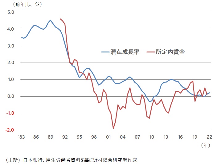 過去を振り返ってみても、名目賃金上昇率が潜在成長率の水準を長期間、大きく上回ったことはない。潜在成長率が名目賃金上昇率の上限となってきたのである(図表)。