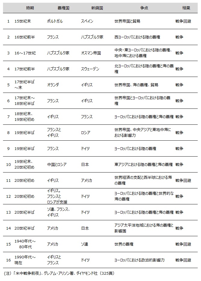 アリソンが率いるハーバード大学のベルファー・センターの研究によると、過去500年にわたる新興国とその挑戦を受ける覇権国との関係を示す16の事例で、実に12件までが戦争に至った、つまりトゥキディデスの罠が当てはまったと分析している。また、20世紀に日本が台頭した際の日露戦争、太平洋戦争などもこれにあたるという。他方、戦争を回避できた事例でも、覇権国が国際システムやルールの改変などの大きな代償を強いられたとされる(図表)。