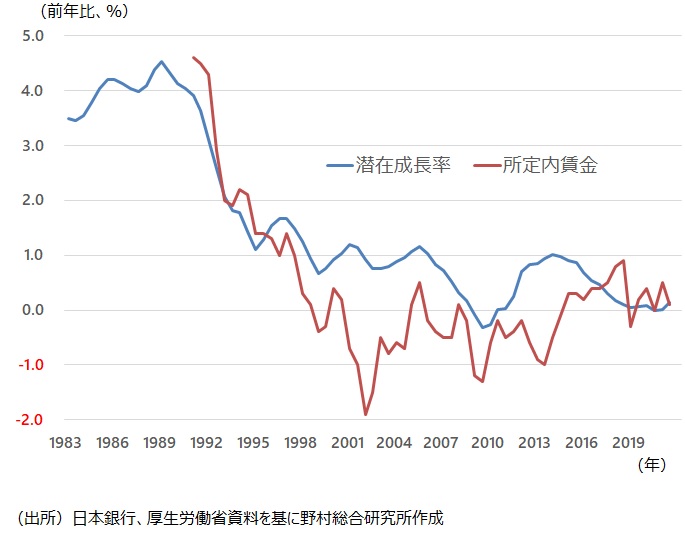 過去を振り返ってみても、名目賃金上昇率が潜在成長率の水準を長きにわたって大きく上回ったことはない。潜在成長率が名目賃金上昇率の上限となってきたのである(図表)。