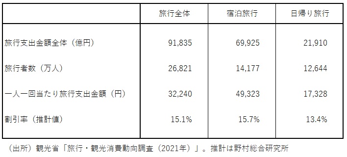 観光省「旅行・観光消費動向調査(2021年)」によると、日帰り旅行の一人一回当たりの平均旅行支出額は17,328円だ。年明け後の「全国旅行支援」では日帰り旅行では3,000円までが割引適用の上限となる。さらに、これに1,714円(平日2,000円、休日1,000円を一週間の曜日日数で案分)分のクーポンが付与されることを考慮すると、実質的な割引率は13.4%と計算される。
