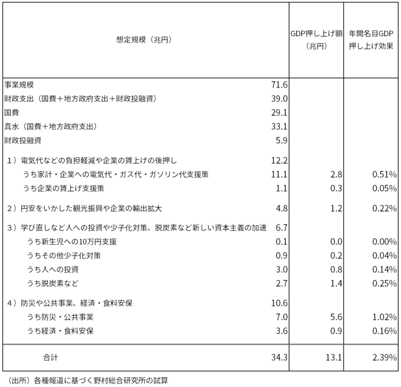 物価高対策によって実質GDPは0.51%程度押し上げられ、その他、新しい資本主義の加速などの施策も合わせると、合計でGDPを2.39%程度押し上げる効果を持つと試算される(コラム「 経済対策経済効果試算値アップデート(GDP押し上げ効果は2.39%) 」、2022年10月28日)(図表1)、(図表2)。