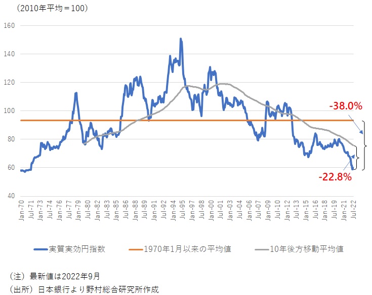 ただし、過去10年の実質実効円指数は、10年移動平均値から大きく下方に乖離しており、均衡水準よりも円安水準が維持されてきたことが分かる(図表)。これは、2013年に導入された日本銀行の金融緩和の影響と、今年のFRBの急速な利上げの影響の2つが重なったものだ。そして、足元ではFRBの利上げ姿勢の変化が意識され始めたことに加えて、今回のYCCの柔軟化措置によって、先行きの日本銀行の金融政策の正常化も意識され始めたのである。この2つの要因がともに変化し始めたことから、過去10年にわたる過大な円安は修正される方向にあると考えられる。