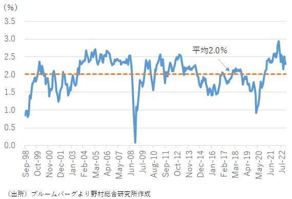 10年物価連動債から計算される金融市場の10年の予想物価上昇率(BEI)は、現在2.2%程度である。これは1998年以来の平均値である約2.0%をわずかに上回る程度の水準だ(図表1)。実際の消費者物価上昇率が1980年代初め以来、40年ぶりの高水準にある中では、異例なほどに低い水準と言えるだろう。