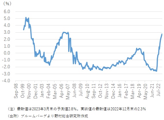 FRBが2022年3月に利上げを開始した時点から、その水準が低下したことを踏まえれば、FRBの利上げが金融市場の予想物価上昇率の安定に寄与しているとも言える。FRB自身は、利上げ実施が遅れてしまった(ビハインド・ザ・カーブ)との認識のもと、昨年11月まで4回連続で0.75%の大幅利上げを実施したが、実際のところは、金融市場はFRBの利上げが遅れることで、物価高騰が持続してしまうとは考えていないのである。
