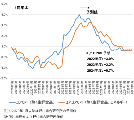 日本銀行が18日に公表した展望レポートでは、2023年度は+1.6%と2022年度の+3.0%から低下した後、2024年度には+1.8%と2%の物価目標に近づいていく形が予想されたが、筆者の見通しでは、2023年度は+2.2%と日銀の見通しを大きく上回る一方、2024年度は+0.7%と逆に日銀の見通しを大きく下回る。