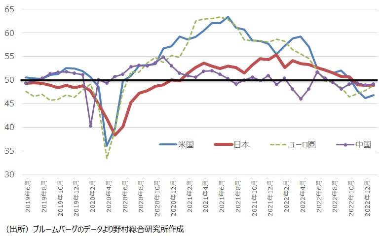 労働市場のひっ迫や、感染問題の緩和を映して、海外でもサービス業は相対的に安定しているが、景気の方向性を示す傾向が強い製造業の景況感は、主要地域ではいずれも判断の分かれ目である50を最新の1月調査まで下回り続けている(図表)。