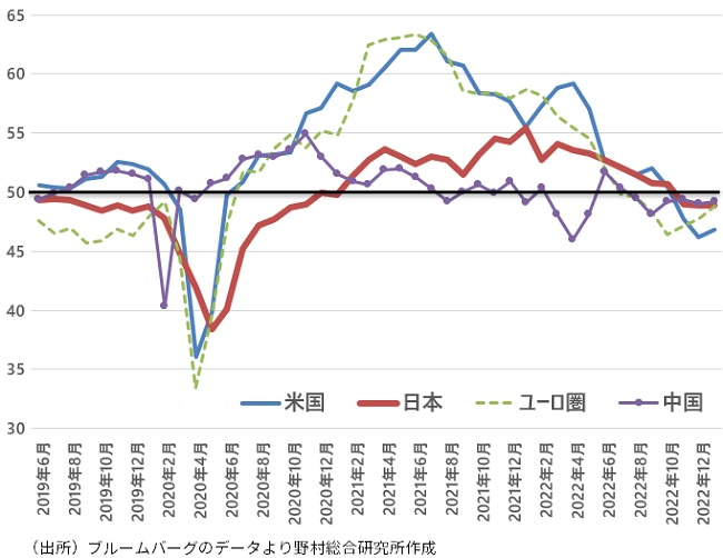 労働市場のひっ迫や、感染問題の緩和を映して、海外でもサービス業は相対的に安定しているが、景気の方向性を示す傾向が強い製造業の景況感は、主要地域ではいずれも判断の分かれ目である50を最新の1月調査まで下回り続けている(図表)。