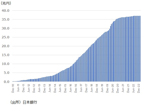 日銀は、年間6兆円というそれまでのETFの買入れ目標を維持しつつも、2019年からは買い入れ額を縮小させ始めた。2020年のコロナショックを受けて、日銀は当面の買入れ目標を年間12兆円に引き上げたが、実際には2020年の年間買入れ額は7.1兆円に留まったのである。さらに、2021年3月の「金融緩和の点検」を受けて、年間買入れ目標を撤廃する柔軟化措置を講じ、それ以降、ETF買入れ額はまさに激減している。