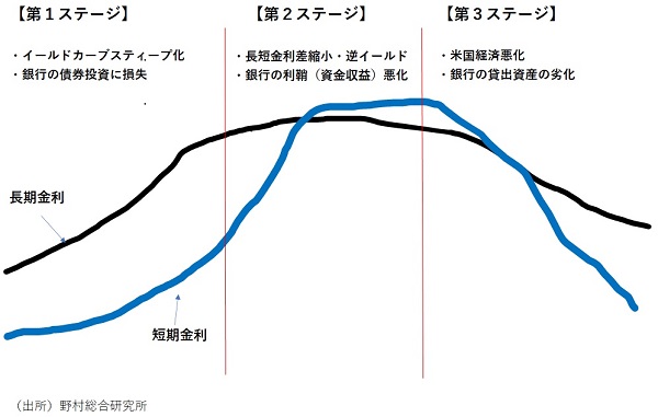 その結果、銀行が保有する国債、政府機関債などの債券に大きな含み損が発生してしまった。そうした債券を売却すれば実現損となり、含み損を抱えたままでも大手行では規制上の自己資本が毀損される、などの財務上の問題が発生したのである。この局面を【第1ステージ】としよう(図表)。