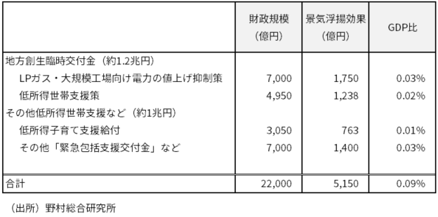 現時点での暫定値ではあるが、この2兆円超の物価対策が実施された場合、名目GDPは5,150億円押し上げられる。さらに、名目・実質GDPは0.09%押し上げられる計算となる(図表)。
