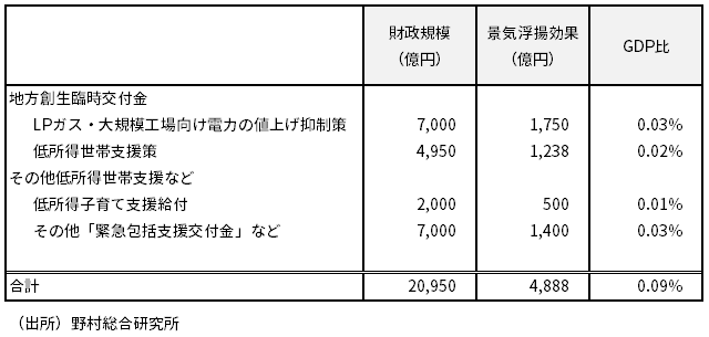 以前に政府による追加的な物価高対策の経済効果を試算したが(コラム「 物価高対策は2兆円超の見込み:現時点での概算で5,150億円の景気浮揚効果 」、2023年3月20日)、その後に得られた情報を加え、本コラムでは改めて試算を行った。それによると、対策は2兆950億円の財政規模で、4,888億円の景気浮揚効果を生むと試算された。これは名目・実質GDPを1年間で0.09%押し上げる(図表1)。