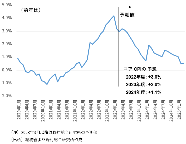 上記の追加物価高対策の効果も踏まえて、この先の物価動向を予想すると、コアCPIの前年同月比はしばらく+3%台で高止まりした後、今年後半から低下傾向を鮮明にし、年末から来年年初には+1%を下回ると考えられる(図表2)。