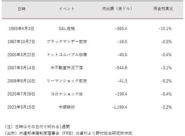 過去に、様々なイベントの下で金融市場が混乱し、中小銀行の預金が流出した際と比べても、今回の預金流出額は突出して大きい(図表3)。まさに銀行危機と呼んでもおかしくない状況だろう。
