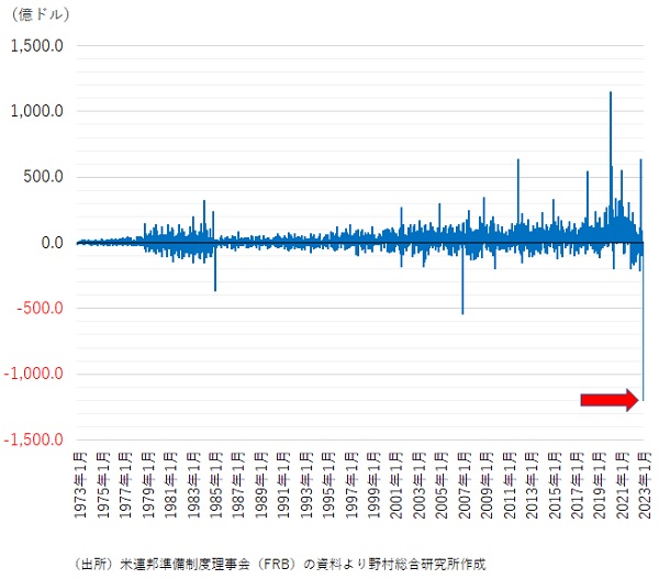 2つの米銀が破綻した3月9日から15日の1週間のうちに、米国の中小銀行の預金は、季節調整値で1,199億ドル(約15.5兆円)減少した。銀行不安が高まり、顧客が預金保険でカバーされていない小口預金を中心に預金を引き出した結果である。8日時点で中小銀行の預金総額は5兆5,759億ドルであったことから、その2.2%相当が1週間のうちに流出したことになる(図表1)。