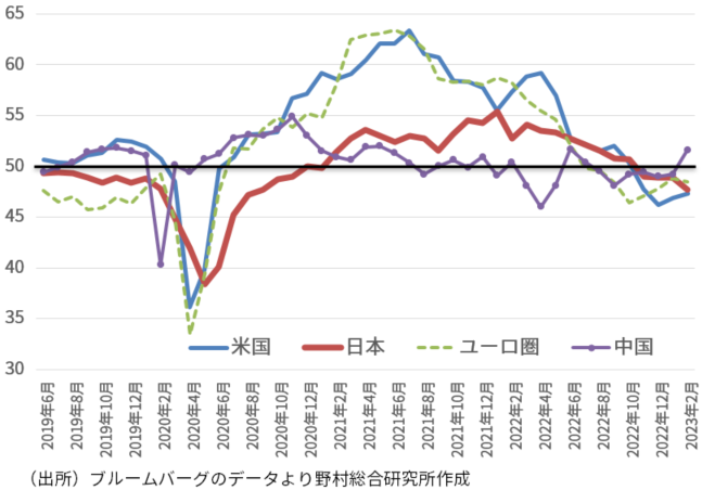 これとは対照的に、製造業の景況感は厳しい。製造業PMIを見ると、中国では、ゼロコロナ政策撤廃の影響などから、製造業の景況感も年明け後には持ち直しているが、その他の主要国、つまり米国、ユーロ圏、日本の製造業PMIは、2月調査でも判断の分かれ目である50を下回っている(図表)。景気の方向性を決める傾向が強い製造業の活動、景況感は低迷しているのである。各国ともに、コロナショックからそれぞれのタイミングで製造業PMIは改善したが、その後は、いずれも低下傾向を辿っている。