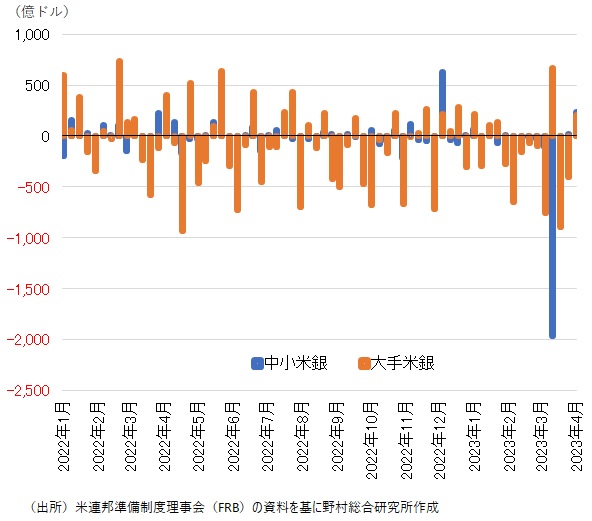 米銀の破綻をきっかけにした銀行不安とこうした資金シフトが重なる中で、大量の預金流出が起こったのである。第1週目は中小銀行から大手銀行に預金がシフトしたが、第2・3週目には、大手銀行からも預金が流出した(図表)。