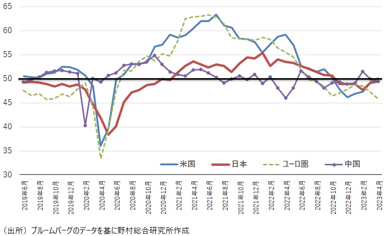 主要国・地域では製造業の弱さが目立っている(図表1)。3月に上振れた中国の製造業の景況感は、4月には再び改善と悪化の判断の分かれ目である50を3か月ぶりに下回った。ゼロコロナ政策解除直後の楽観論は後退し、再び先行きの経済に慎重な見通しが出てきている。