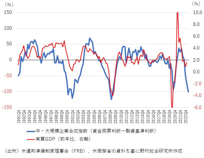 他方、米国では、急速な金融引き締めの影響に加え、3月以来の銀行不安による資金ひっ迫傾向が、企業活動の強い逆風となっている。米連邦準備制度理事会(FRB)の融資調査(4月)によると(コラム「 米銀の融資基準厳格化と企業の資金需要鈍化が同時進行(FRB銀行融資調査) 」、2023年5月10日)、銀行の企業向け融資基準の厳格化と企業の資金需要の悪化が同時に進行しており、双方の要因を合わせた指数でみると、過去の本格的な景気後退と同程度まで金融環境は悪化していることが分かる(図表2)。