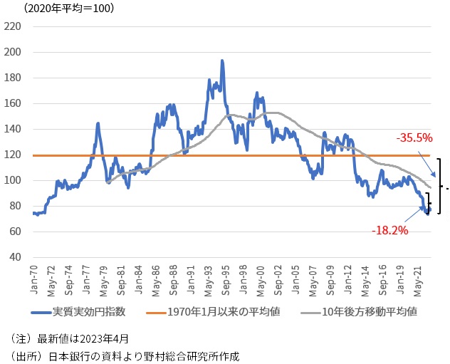 10年前に日本銀行が異例の金融緩和を導入したことをきっかけに円安が進み、行き過ぎた円安水準が維持されてきた、と考えられる。実質実効円レートは、当時から10年移動平均値を一貫して下回る円安水準にある。