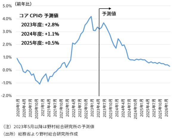 筆者は2023年度のコアCPIは前年度比+2.79%、2024年度は+1.07%と予想しているが、これは、ドル円レートが1ドル130円で推移することを前提とした見通しである(図表)。