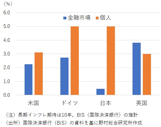 国際決済銀行(BIS)は6月に公表した年次経済報告書の中で、金融市場と個人について、主要国での長期(10年)インフレ期待を計測している。