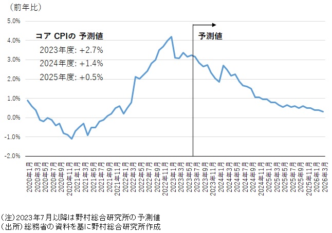 今回の6月分CPIの数字を踏まえて先行きの物価を見通すと、2023年度のコアCPIは前年比+2.7%、2024年度は+1.4%、2025年度は+0.5%と、先行きの物価上昇率は低下傾向を辿ることが予想される(図表1)。