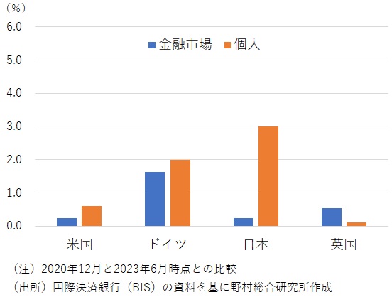 他方、金融市場の長期インフレ期待には大きな変化は見られないものの、個人の長期インフレ期待が最も大幅に上昇したのが、日本である(コラム「 金融政策姿勢の違いで欧米と日本の長期インフレ期待の上昇に差:米国の実質政策金利上昇はいずれ経済・金融に強いストレスに 」、2023年7月3日)。それは2020年末から2023年6月時点までの間に3.0%ポイント上昇し、+5.0%にまで達している。日本銀行の物価目標値である+2%を大幅に上回る水準だ。