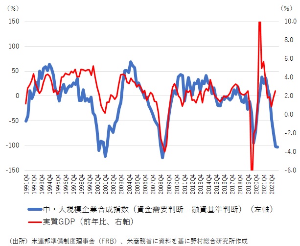 しかしながら、米国経済との関係が密接なのは、中・大規模銀行の商業・産業向け貸出態度の厳格化と企業の資金需要である。両者を合計した指数と米国の実質GDPとの関係は、過去の経験則に照らせばかなり密接である(図表)。足もとの米国の実質GDP統計は予想よりも上振れているものの、企業関連の資金の流れは、過去の景気後退時に匹敵する厳しい状況を示している。