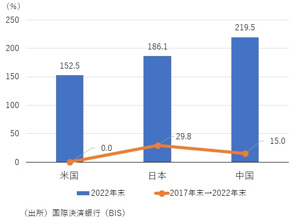 国際決済銀行(BIS)によると、中国の非金融民間部門債務のGDP比率は2022年末時点で219.5%となっている。これは、米国の152.5%を大きく上回ってい る(図表3)。そのうち非金融企業の比率は158.2%と米国の78.1%の2倍近くにまで達している。
