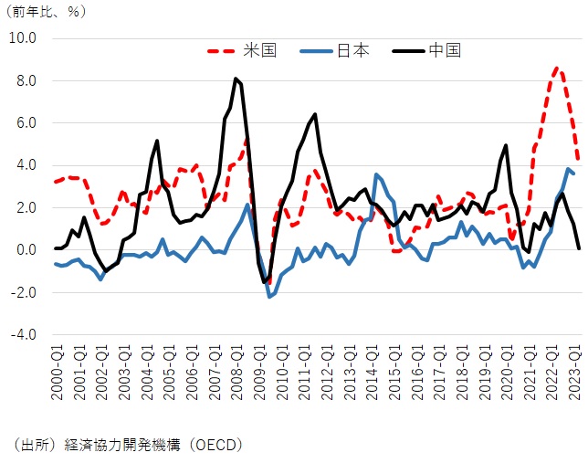 こうした物価上昇率の低迷と不動産価格の下落は、景気の減速傾向と並行して生じている。7月17日に発表された4-6月期の実質GDPは前期比+0.8%、年率換算で3%強と、成長率が大きく鈍化した。2023年の政府目標である「5.0%前後」の達成にも黄色信号が灯っており、達成できなければ2年連続となってしまう。