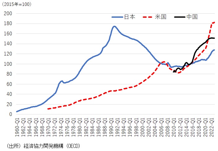 2020年に本格化したコロナ禍による経済悪化への対応として、多くの国では大幅な金融緩和策が実施され、それを契機に住宅価格の高騰がみられた。しかし中国では、それより前の2015年頃から、住宅価格の上昇ペースが加速を始めた。そして、2022年4-6月期をピークに、住宅価格は下落に転じている(図表2)。ちなみに米国では、歴史的な物価高騰への対応として2022年から大幅な金融引き締めが実施されているが、その影響もあり、住宅価格はようやく足元で上昇に歯止めがかかりつつある状況だ。