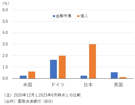 米国などと比べて日本では、個人の長期のインフレ期待が大幅に上振れていることが注目される。国際決済銀行(BIS)の計算では、2020年末から3%ポイントも上振れ(図表2)、足元で+5%に達している。欧米の中央銀行とは異なり、2%の物価目標にこだわる日本銀行が、物価上昇率が上振れる中でも金融政策を修正せず、長期のインフレ期待の上振れを容認してきたことが大きく影響しているのではないか。この点から、今後、欧米での物価上昇率は比較的迅速に低下する可能性がある一方、日本では、物価上昇率の低下が遅れるリスクがあるだろう。