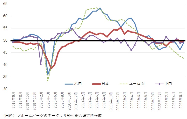主要国では製造業の景況感が低迷を続けている。7月の製造業PMIは、日本、米国、中国、ユーロ圏のすべてで、判断の分かれ目である50を下回った(図表1)。これは、6月に続き2か月連続である。特に悪化が顕著であるのはユーロ圏だ。7月のユーロ圏の製造業PMIは42.7と6月の43.4から一段と悪化した。新型コロナ問題が本格化した2020年5月以来の極めて低水準である。