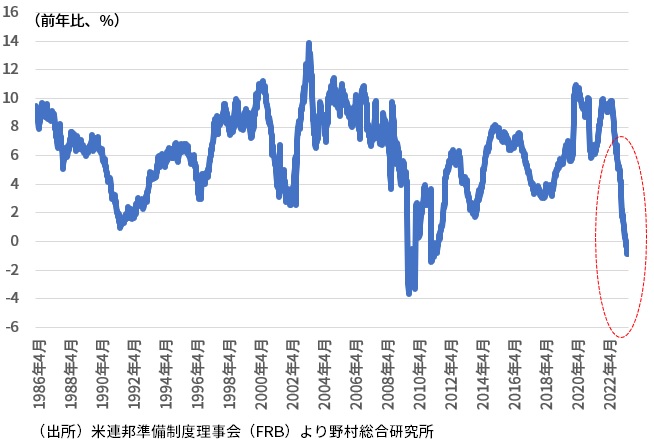 米銀の貸出残高は、足もとで前年比マイナスであり、2011年5月以来の低水準となっている(図表)。地銀の経営破たんは現状では収まっているが、地銀の収益環境の厳しさは4-6月期の決算で明らかとなり、それを受けて大手格付会社による一部銀行の格下げ、銀行株全体の株価下落などが足元でみられている。