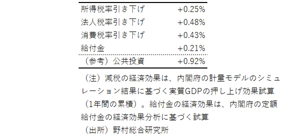 仮に5兆円分の所得減税が実施される場合には、実質GDPを1年間で+0.25%押し上げると試算される(図表)。ただしこれは、恒久措置としての減税の効果であり、時限的措置の場合には効果は半減すると見込まれる。その効果は実質GDPを1年間で+0.12%押し上げる、と試算される。相応に財政負担を高め、財政環境を一段と悪化させる一方、経済効果は限定的と言えるだろう。