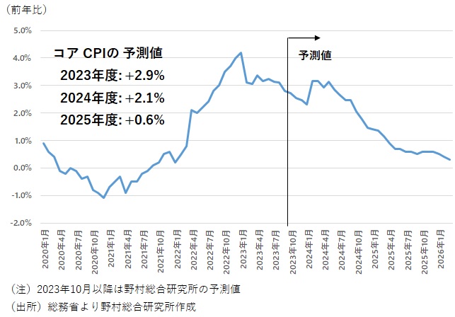 9月分の実績を反映して物価見通し(コアCPI)を改定すると、2023年度は+2.9%、2024年度は+2.1%、2025年度は+0.6%となった(図表)。2022年度から3年連続でコアCPIは2%を上回った後、2025年度には1%を割り込む見通しだ。