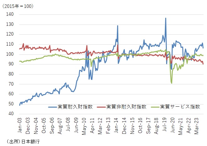 また、2023年10-12月の実質非耐久財消費、実質耐久財消費、実質サービス消費はそれぞれ前期比-2.2%、同-0.2%、同-0.3%といずれも減少した(図表2)。