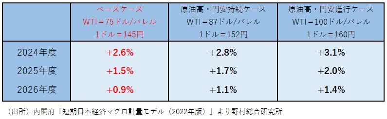 「原油高・円安進行ケース(WTI100ドル、1ドル160円)」では25年度の物価も2%超に