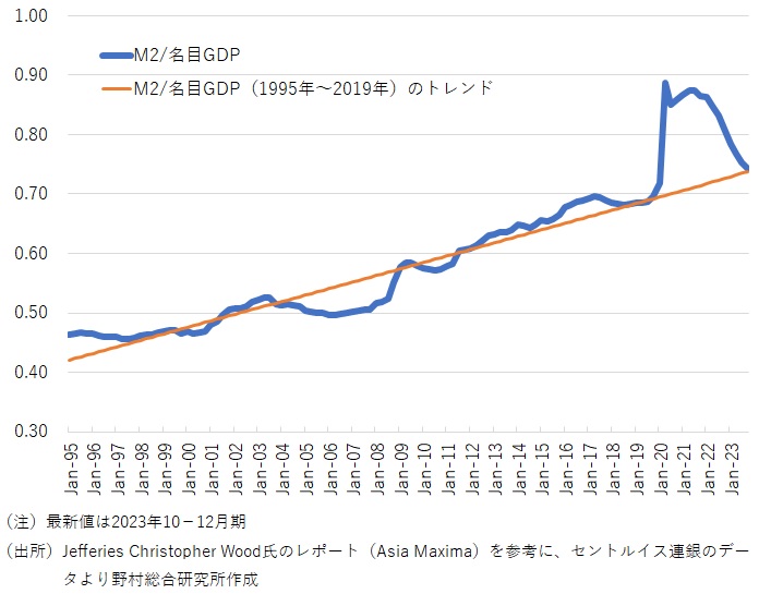 しかし、M2の名目GDP比は、昨年末頃には過去のトレンド上に戻ってきており、過剰流動性の状況は概ね解消されたと考えられる(図表1)。この点から、この先については、金融引き締めの効果が顕在化しやすい可能性があるだろう。