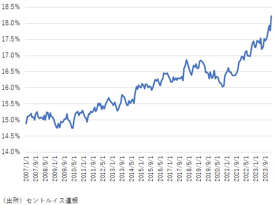 そして、もう一つ考えられる要因は、移民の増加である。米国への移民の増加は、働き手の増加と消費者の増加という、需要・供給の両面から経済活動を活性化させる。米国の人口に占める外国人(海外生まれ)の比率は、コロナ問題発生後に一時低下したがその後に急速に高まり、最新の2024年2月には18.2%に達している(図表2)。