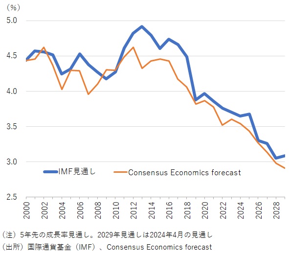 リーマンショック発生直後の2009年に、5年先すなわち2014年の成長率見通しは+4.8%だった。それが2024年の5年先すなわち2029年の成長率見通しは+3.1%と、15年の間に約1.7%ポイントも低下している。