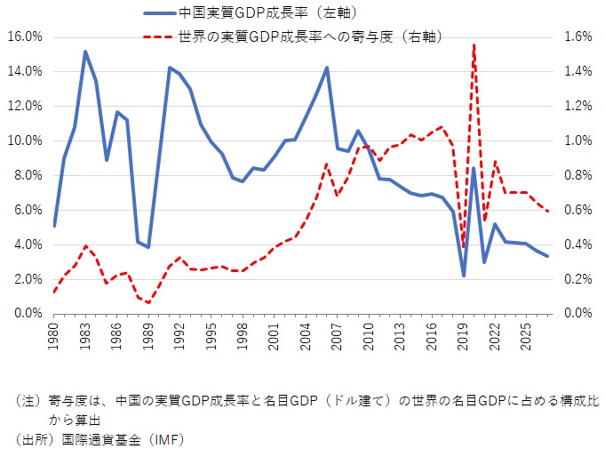 図表1で見た世界の中期成長率見通しの低下には、中国の成長率見通しの下方修正が大きく影響している。2018年には、中国が世界の実質GDP成長率を年間+1.1%押し上げていたと試算される。しかしIMFの見通しに基づくと、それは2024年には+0.7%、2028年には+0.6%にまで低下する。2018年から2029年にかけて、世界の中期成長率見通しは1.5%ポイント程度低下しているが(図表3)、そのうち0.5%程度、つまり3分の1程度は中国の要因と考えられる。