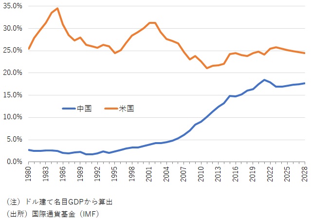 予想外の中国経済の失速は、世界経済における米国と中国とのバランスの見通しに、大きな修正を迫っている。中国の名目GDPは、2020年代の終わり頃には米国を追い抜き、世界一になるとの見通しが最近まで一般的だった。しかし、過去数年間の成長率の下振れを受けて、中国経済が米国経済を追い抜くとの見通しは、今ではかなり後退してしまった。