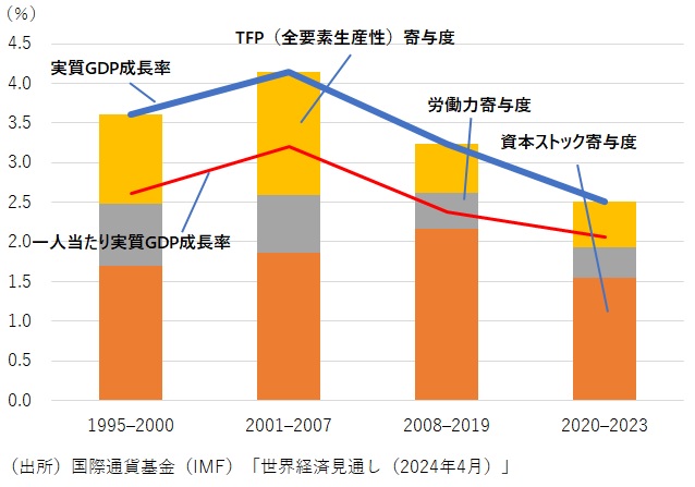この成長率の低下に最も大きな影響を与えたのが、技術進歩、労働者の質向上、資本・労働の効率的な組み合わせなどに左右される生産性を示す全要素生産性(TFP)の成長寄与度低下である。それは0.91%ポイントの成長率低下のうち、0.94%ポイントの押し下げ要因となった。
