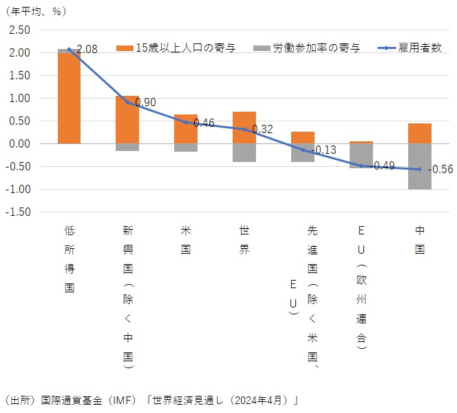 国際通貨基金(IMF)は、2024年から5年先までの雇用者数の増加率(年平均)を地域別に予測している。低所得国では雇用者数は年平均+2.1%と高い増加率が維持される見通しだ。雇用増加率は、低所得国が最も高い一方、新興国、先進国と一人当たりの所得水準が高まるに従い、低下する傾向がみられる。そうした中、例外的な見通しとなっているのが米国と中国だ。