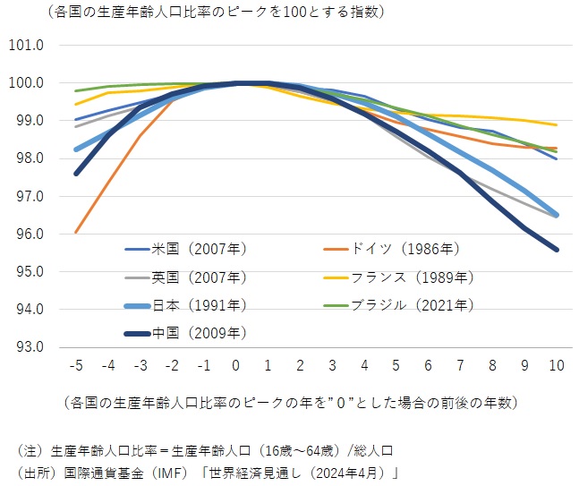 「生産年齢人口比率」がピークをつけるタイミングは、各国で大きなばらつきが見られたが、その後の低下ペースも様々だ。ピークから10年の期間で見ると、米国、ドイツ、フランス、ブラジルでの低下ペースは比較的緩やかであったが、それと比べると、日本と英国での低下ペースは速く、「人口オーナス」の逆風は強い。